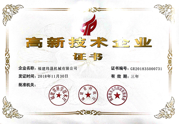 獲得國家高新技術企業認證是瑋晟機械公司2018年制定的一項發展規劃。申報過程中,在財務部、技術部、行政部等相關部門的密切配合及泉州市科學技術委員會等多個部門的聯合審定下,福建瑋晟機械順利通過認證。